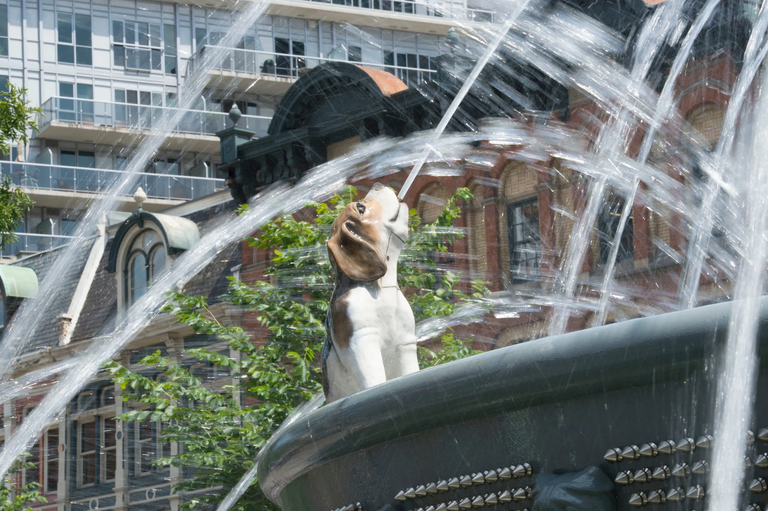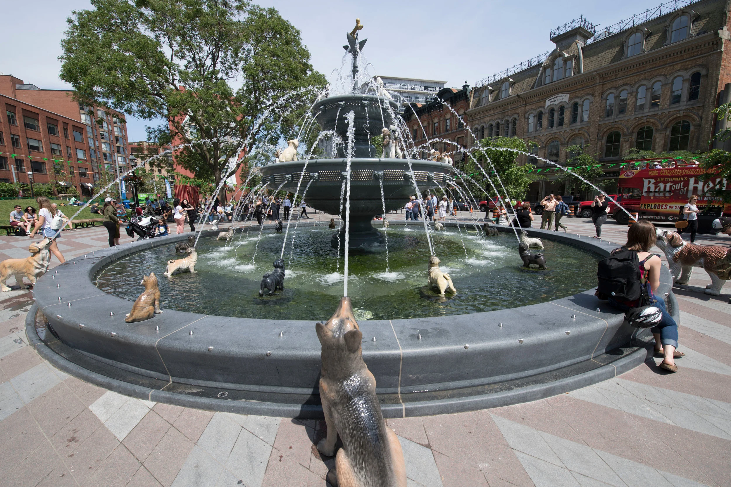 Somerville is very excited about the recently completed Berczy Park. In 2016 and 2017 we undertook the “innovative and artful” restoration of Berczy Park which was designed by Claude Cormier & Associates. The project, situated between Front Street and Wellington Street adjacent to the Flatiron Building, included the reconstruction of Scott Street; a wide prominent central plaza with granite mosaic paving; grassy berms, garden beds and new trees; park benches and seating platforms; lighting and water filling stations; and a large two-tiered fountain with 27 dog sculptures. The park opened to the public in the summer of 2017.
